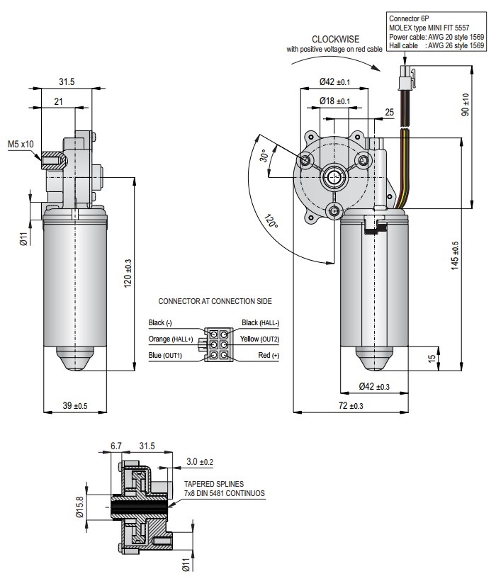 DCGM 43 T42 (Links). compacte wormwiel gelijkstroommotor. as uitvoering: Hol. Spline, incl. 2 kanaals hall encoder.