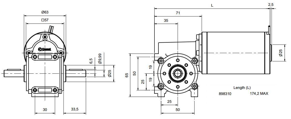 DCmind Borstel DC motor, 63mm- Max. 70W. 12VDC + Wormwielvertraging RAD10, i = 15:1, uitgaande as WG2 (links+rechts), 89831