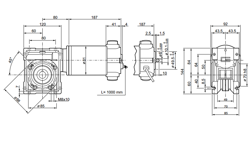 Borstel gelijkstroommotor ZDC180, 24VDC/250W (S2), incl. achteras + wormwielreductor holle as, type ZW050, i = 100:1, Let op! Max. uitgaand koppel, zie de belastinggrafiek (ZW81-180-050-100-24VDC-AA)