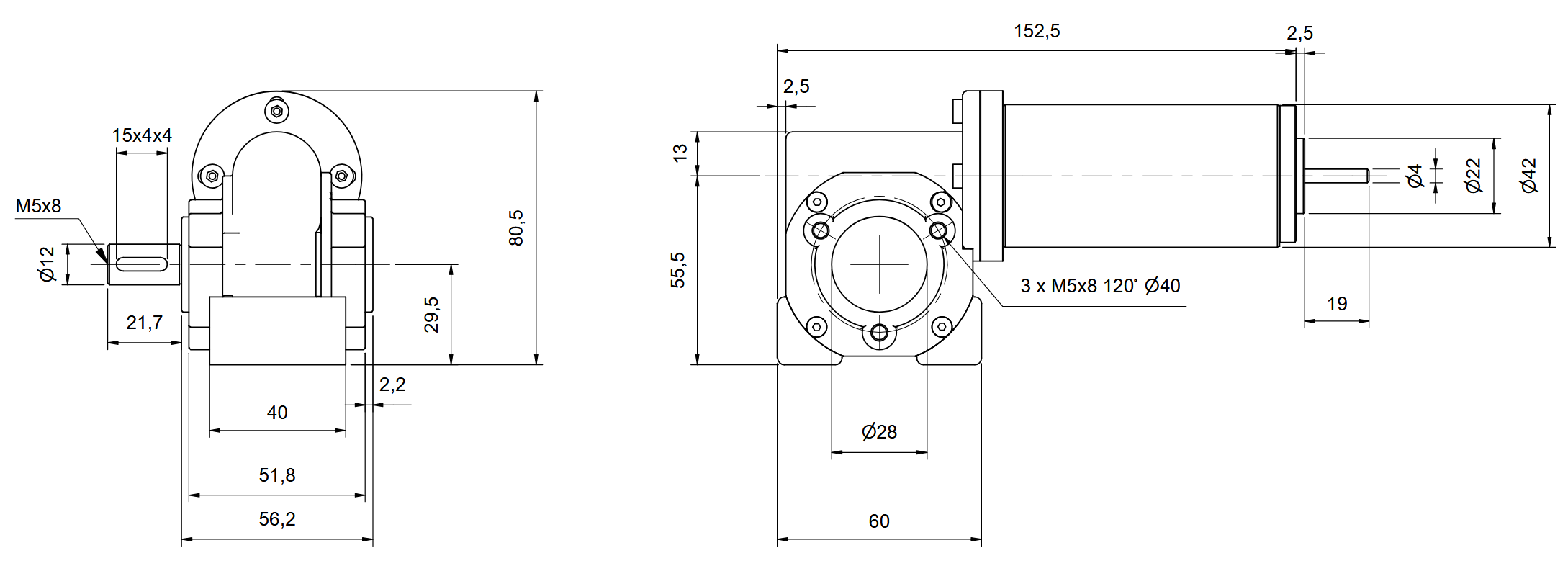 Borstel gelijkstroommotor ZDC4218, 24VDC, incl. achteras + wormwielreductor type ZW026B, i = 10:1, uitgaande as rechts.