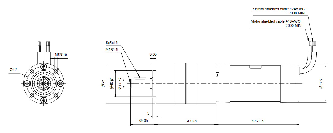 Borstelloze DC-motor, 57mm, 24Vdc, met Hall-feedback, kabellengte 2 mtr., voorzien van een planetaire vertraging IMS.62-Pro-LN (low noise), i = 45:1