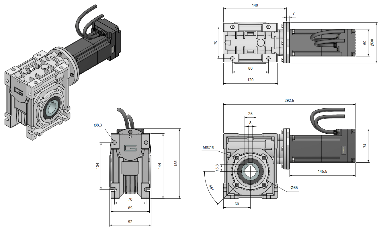 Kinco 280W DC-servo motor met geïntegreerde versterker en aangebouwde wormwielreductor, kabeluitvoering voorzien van IP67 connectoren, incl. houdrem, CANopen & Modbus communicatie, reductieverhouding van i=5 t/m i=80, nom. uitgaand toerental van 37,5rpm t/m 600rpm.