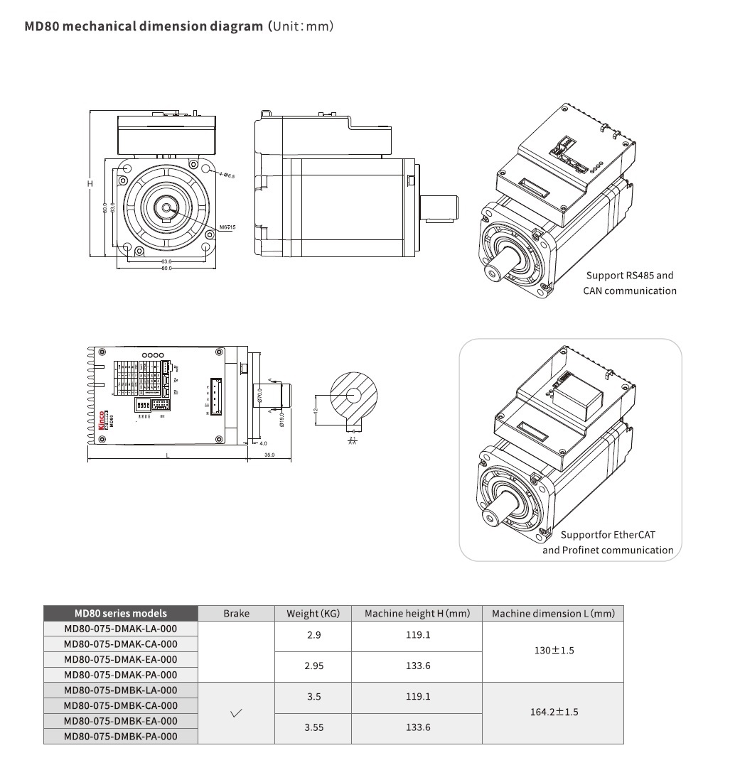 DC-Servo motor MD80-750W + versterker, communicatie RS232/EtherCAT + rem