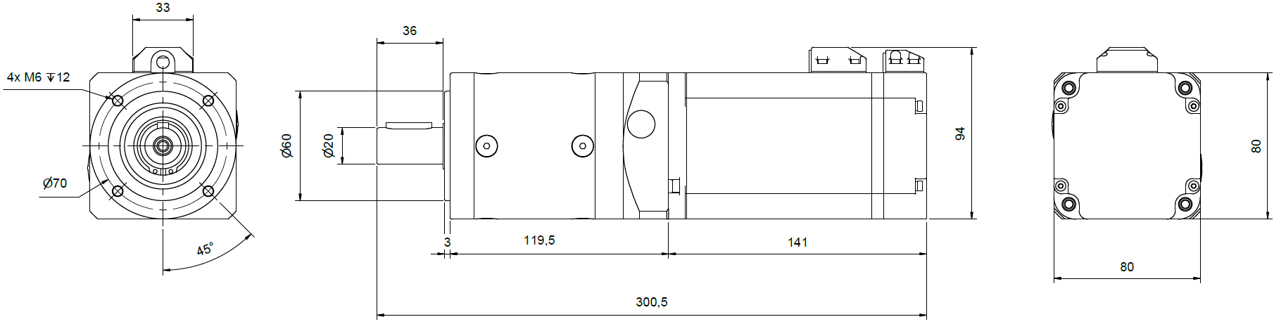 Kinco 750W DC-servo motor met aangebouwde planetaire reductor, kabeluitvoering voorzien van IP67 connectoren, incl. houdrem, reductieverhouding van i=9 t/m i=80, nom. uitgaand toerental van 37,5rpm t/m 333rpm.
