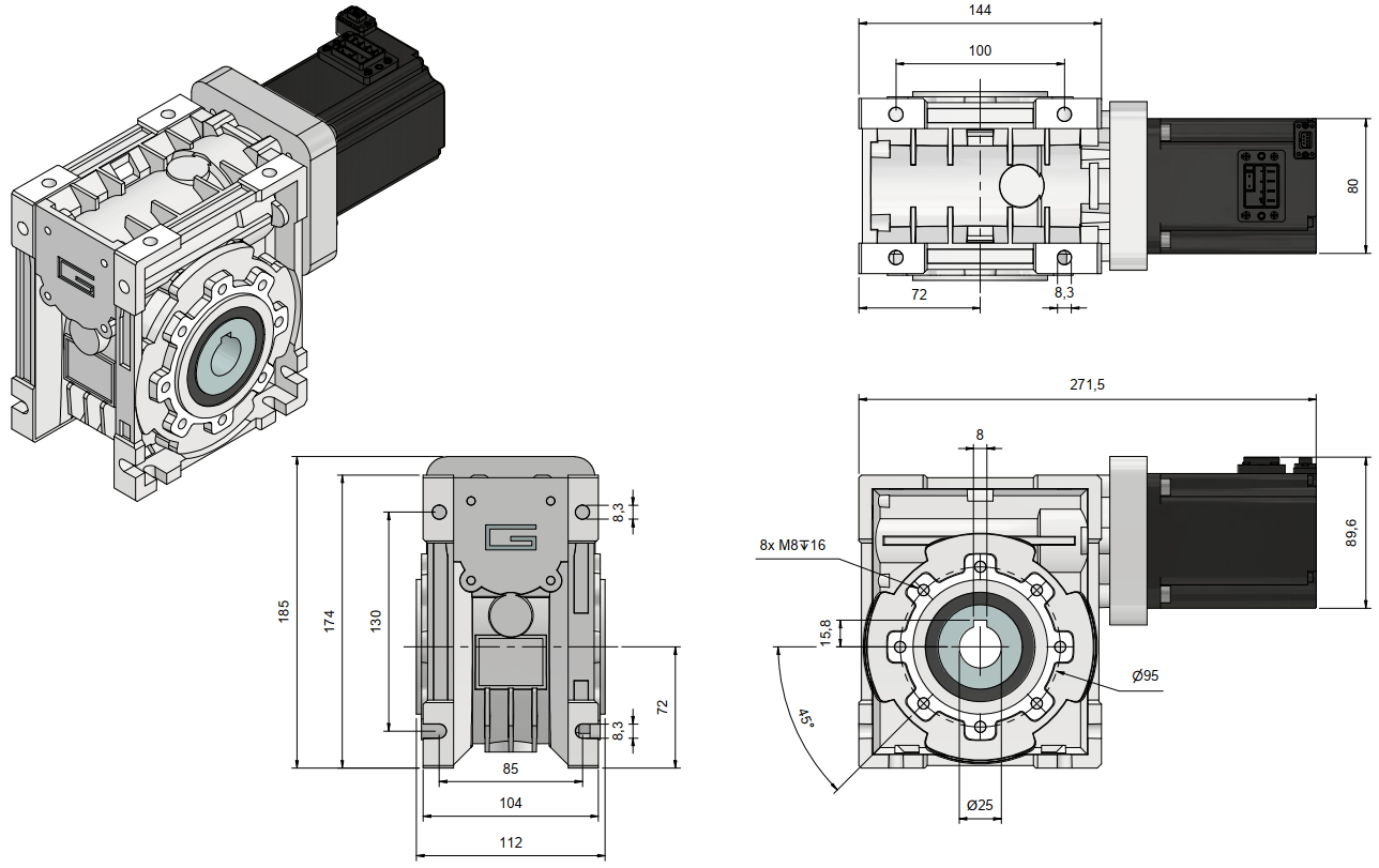 Kinco 750W DC-servo motor met aangebouwde wormwielreductor, voorzien van geïntegreerde IP67 connectoren, reductieverhouding van i=5 t/m i=60, nom. uitgaand toerental van 50rpm t/m 600rpm.