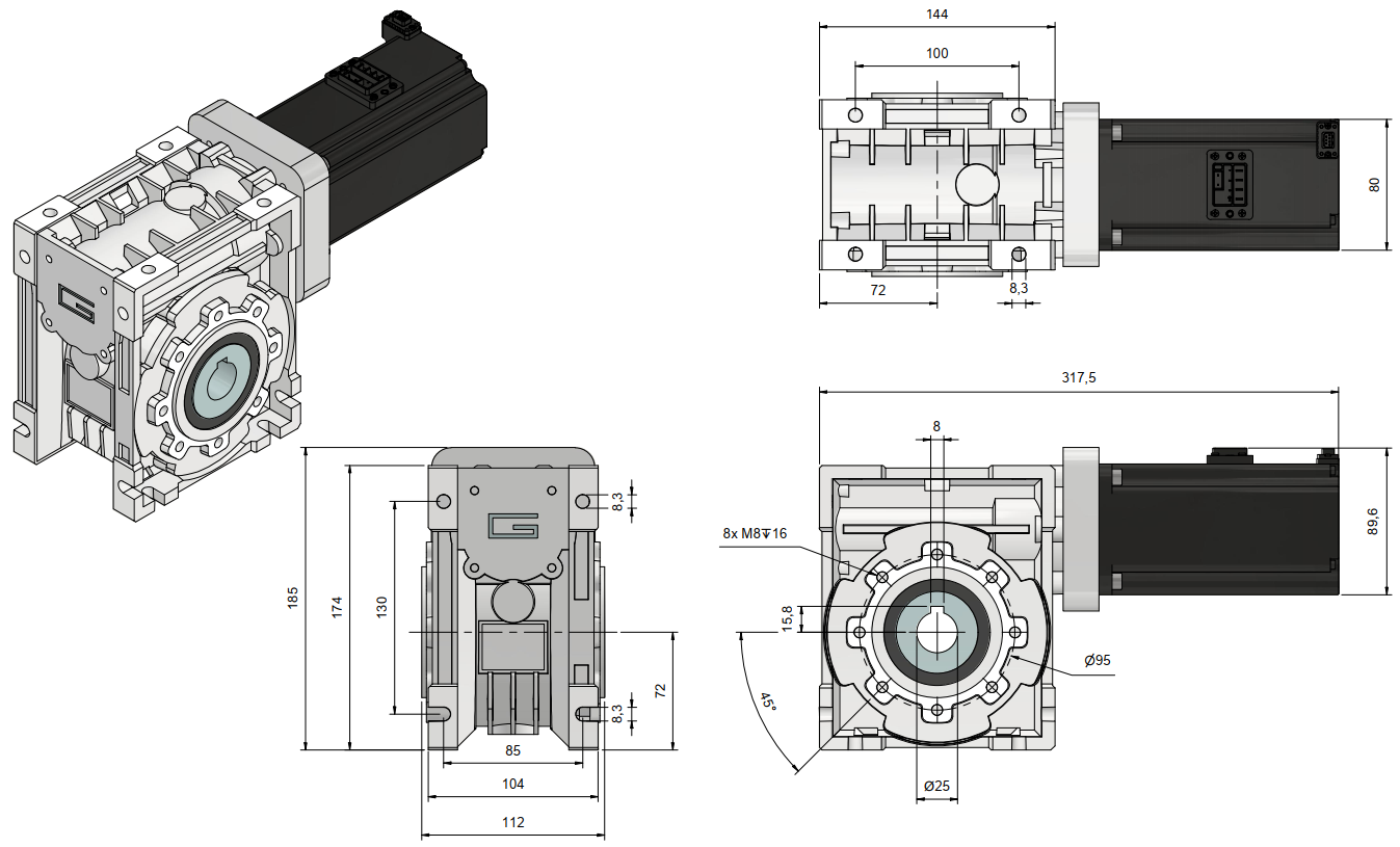 Kinco 1000W DC-servo motor met aangebouwde wormwielreductor, voorzien van geïntegreerde connectoren, incl. houdrem, reductieverhouding van i=5 t/m i=60, nom. uitgaand toerental van 50rpm t/m 600rpm.