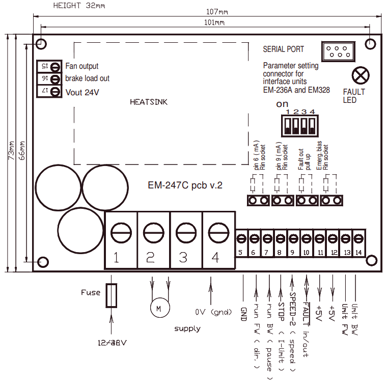 Electromen EM-247C, PWM-gebaseerde regelaar voor borstelmotoren. Universeel inzetbaar met o.a. traploos instelbare snelheid, acceleratie, deceleratie, stroombegrenzing en remweerstand uitgang. Instelbaar via EM-236A of PC software.